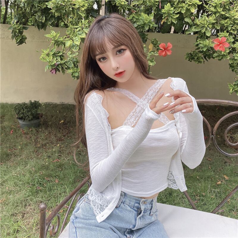 秋商品〜レーストップスとベストのツーピースニットカーディガン ブラックストロベリース58528761066