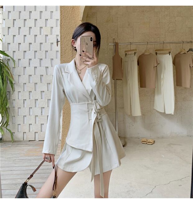 ホワイトカジュアルスーツカラードレス女性秋小長袖ショートスカート2020新ウエスト気性スカート ブラックストロベリース41089386153