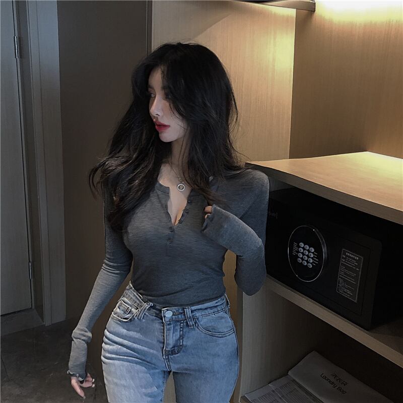 木製の耳が付いたVネックのブラウス、長袖のタイトフィットのセクシーなTシャツ、女性の秋と冬の黒のスリムフィットインナーベースシャツ ブラックストロベリース14953967022