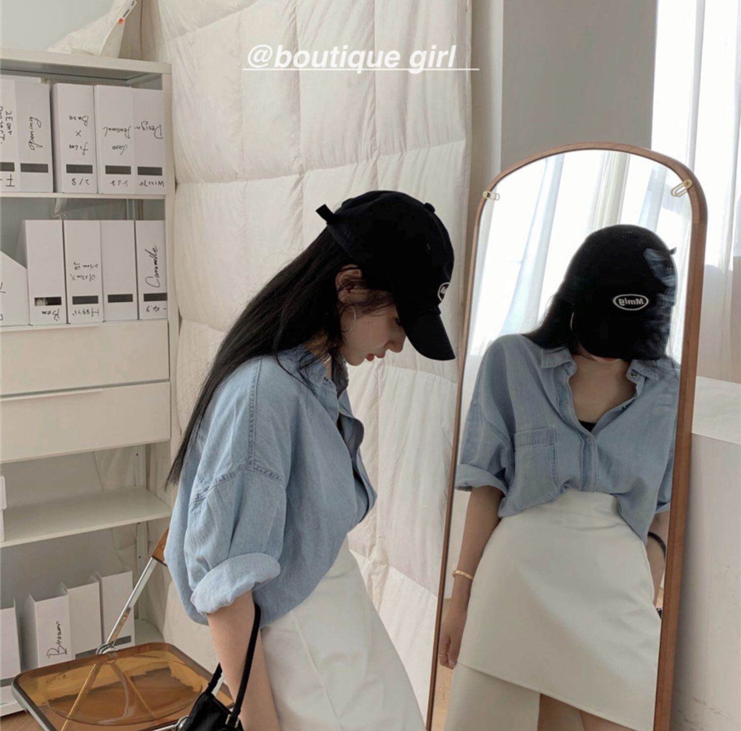 色:デニムシャツ,白い革のスカート