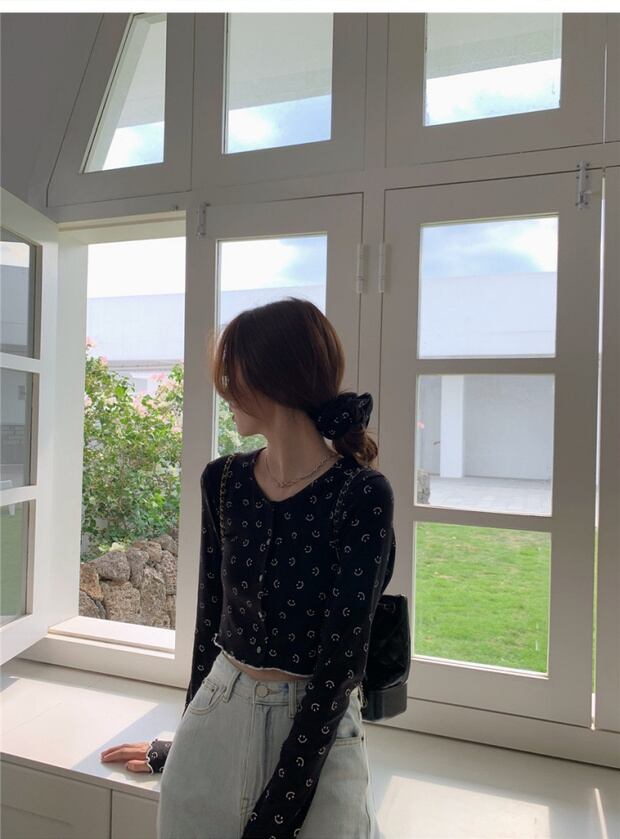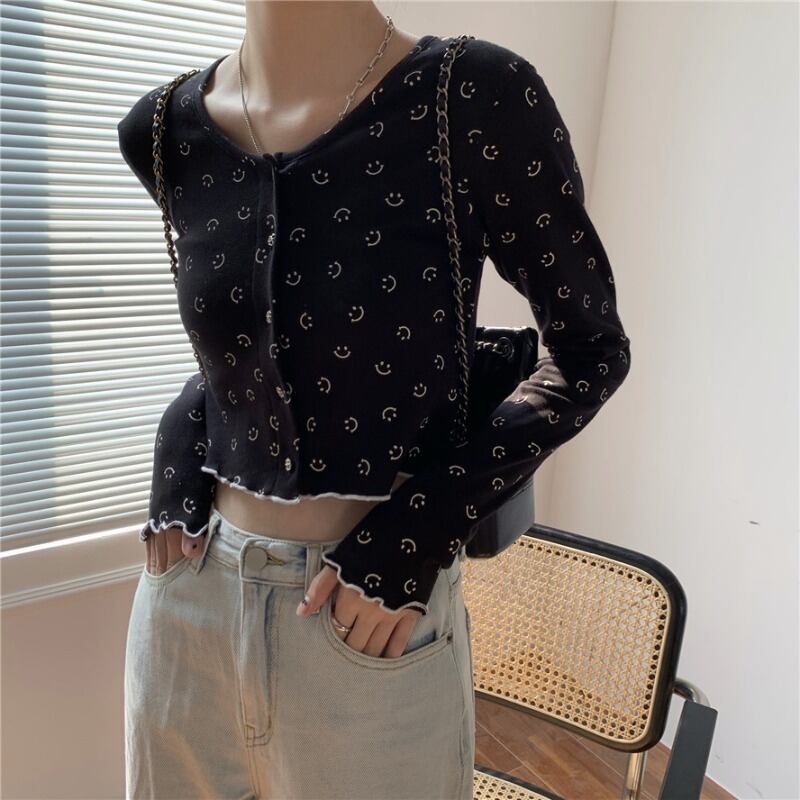 スマイリーフェイスが木製の耳にプリントされた黒のニット日焼け止めカーディガン、女性の秋の長袖の薄いジャケット、短いアウタージャケット ブラックストロベリース40184862494