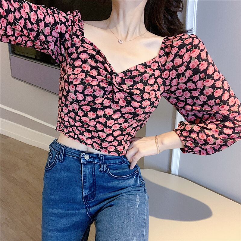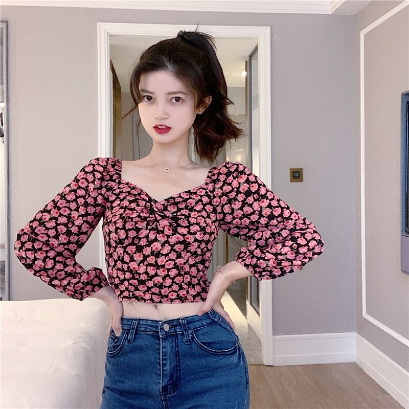 ローズフローラルデザインセンス長袖シャツトップレディース2020秋新ニッチスリムショートVネックシャツ ブラックストロベリース83120706822
