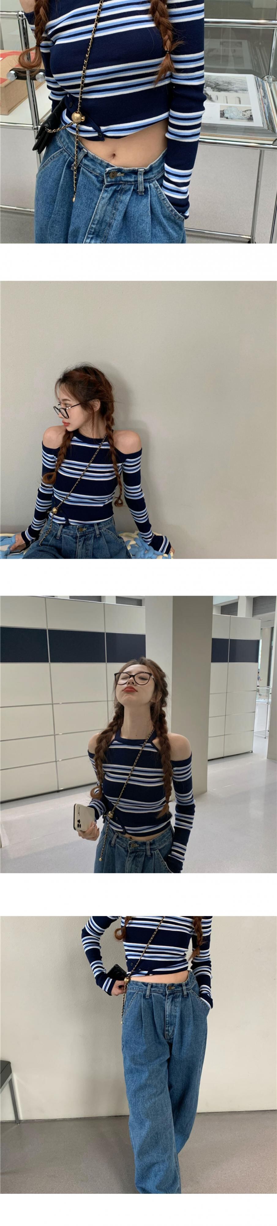 ストライプ長袖Tシャツレディース初秋ハンギングネック丁寧なマシンストラップレスボトミングシャツタイトなデザインニッチショートトップ ブラックストロベリース9282710501