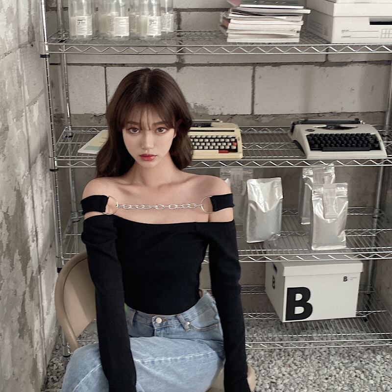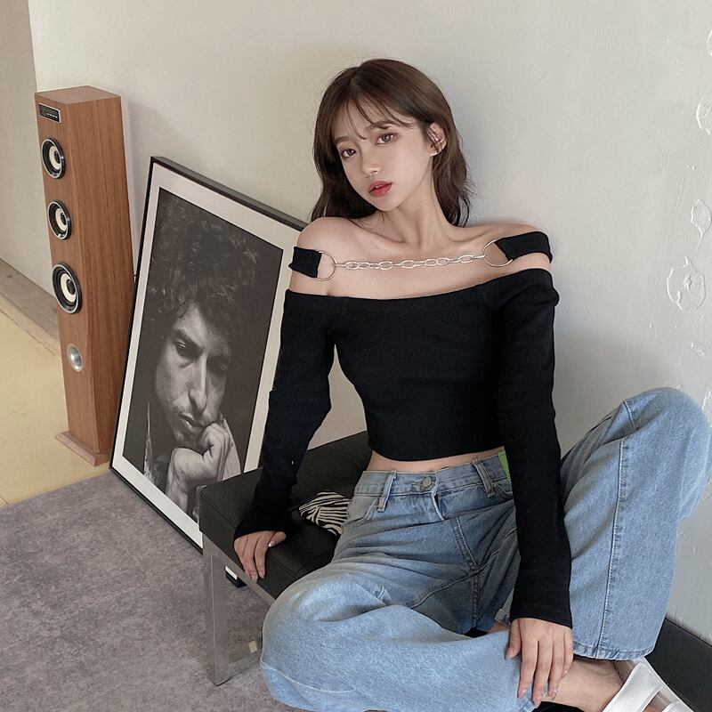セクシーなオフショルダーの黒のニットTシャツの女性の秋タイトフィット長袖ボトミングシャツチェーンショートインナートップイン潮 ブラックストロベリース34870320178