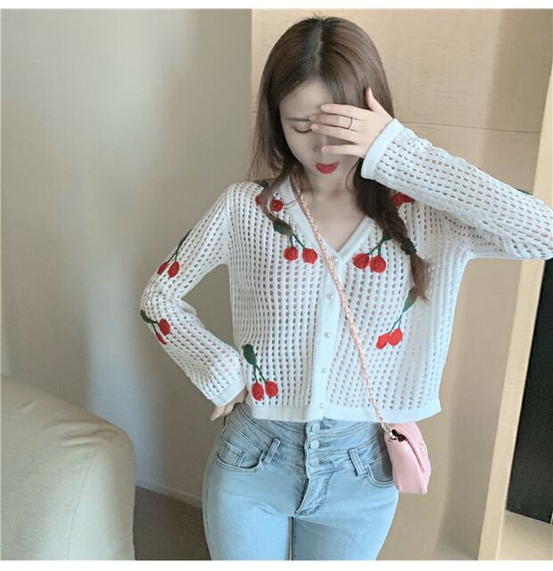 中空Vネック長袖ニットスモールカーディガンレディース秋スリムショートコート2020新しいセーターホワイトトップ ブラックストロベリース27359383200