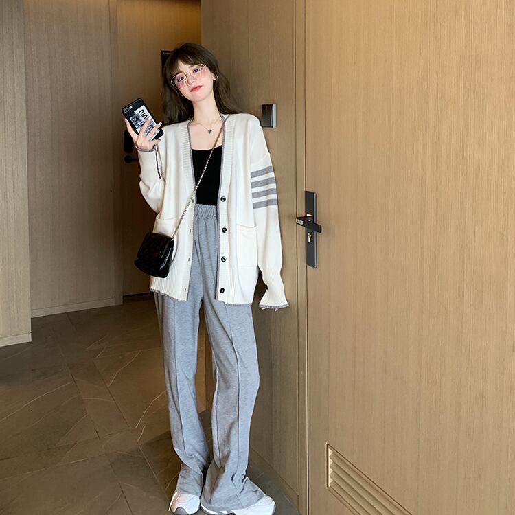 優しい風の白いVネックストライプニットセーターカーディガン女性の2020年秋新しいルーズ長袖ジャケットトップ ブラックストロベリース90608145700