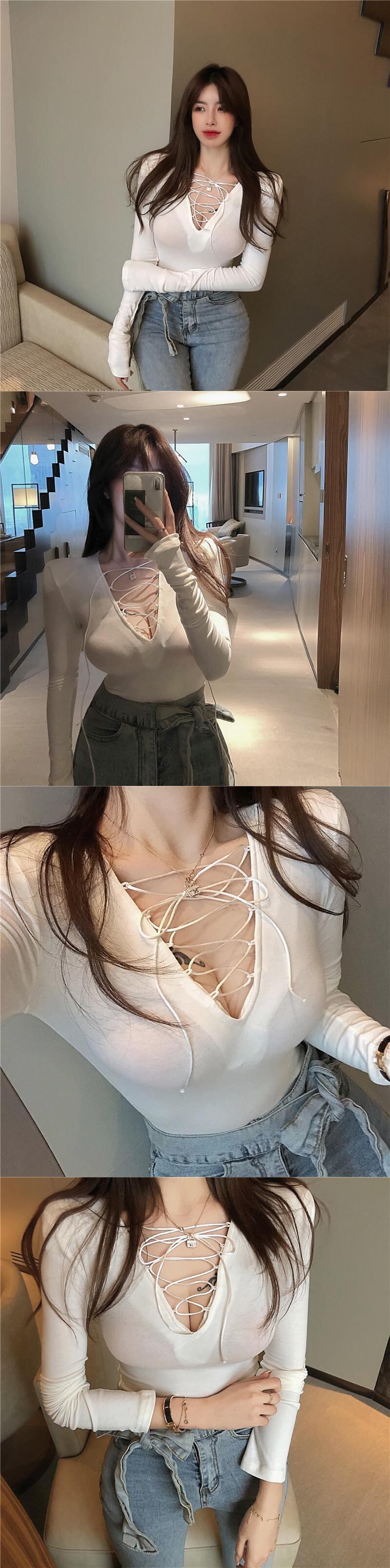 センスレースVネックニットTシャツレディースオータムピンク長袖タイトセクシートップボトミングシャツinstide ブラックストロベリース71497270421