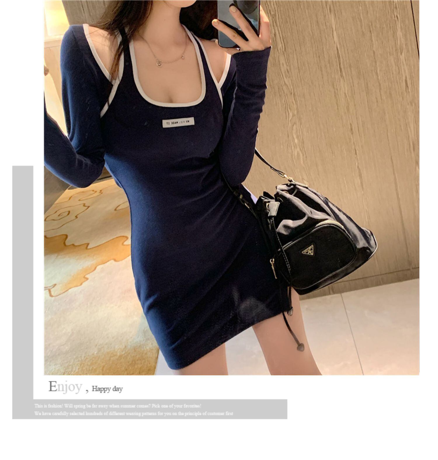 ハンギングネックストラップ長袖ブルードレス女性初秋セクシータイトフィットヒップスカート2020新気性スカート ブラックストロベリース91996640339