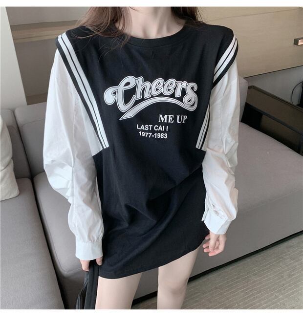 偽の2つのルーズな長袖プリントTシャツの女性2020年秋新しいシックなミドルレングスのブラックトップイン ブラックストロベリース93759999843