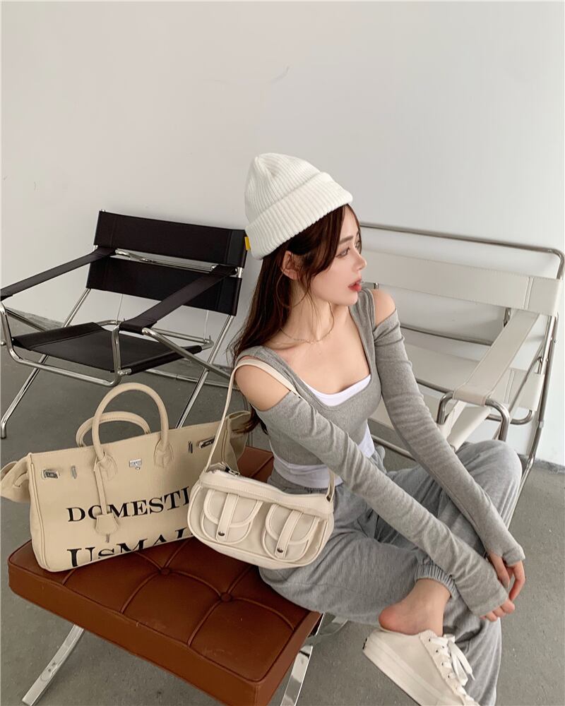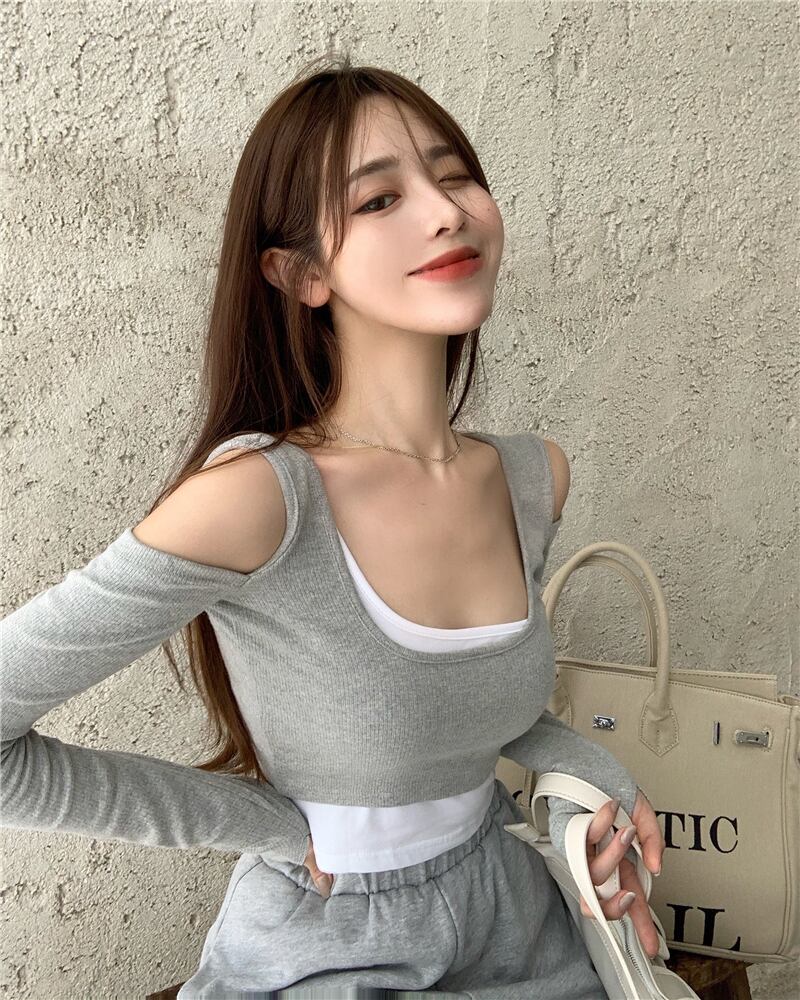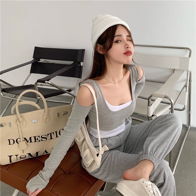 ストラップレス折りたたみフェイク2長袖ニットTシャツレディース2020年秋タイトフィットアンダーシャツトップ ブラックストロベリース74838129988