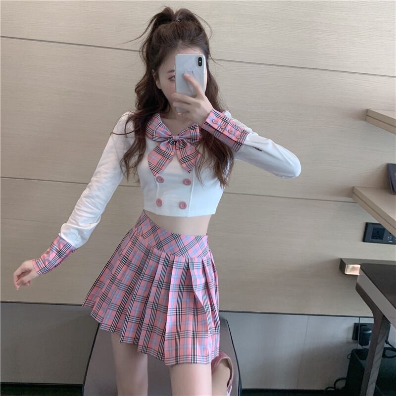 ボウノットシャツトップハイウエストプリーツチェック柄スカート女性2020年秋新作スーツ年齢削減ツーピース ブラックストロベリース14643838195
