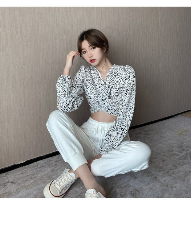 ヒョウ柄デザインショートシャツレディース初秋セクシーオープンバックレース長袖Vネックシャツニッチ衣装 ブラックストロベリース12986467089