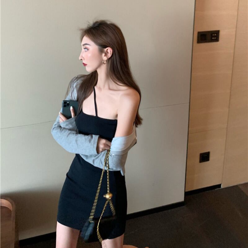 ワンショルダーチューブトップベストサスペンダードレス女性の2020年秋新しいベーススカート黒気質スカート ブラックストロベリース88024500613