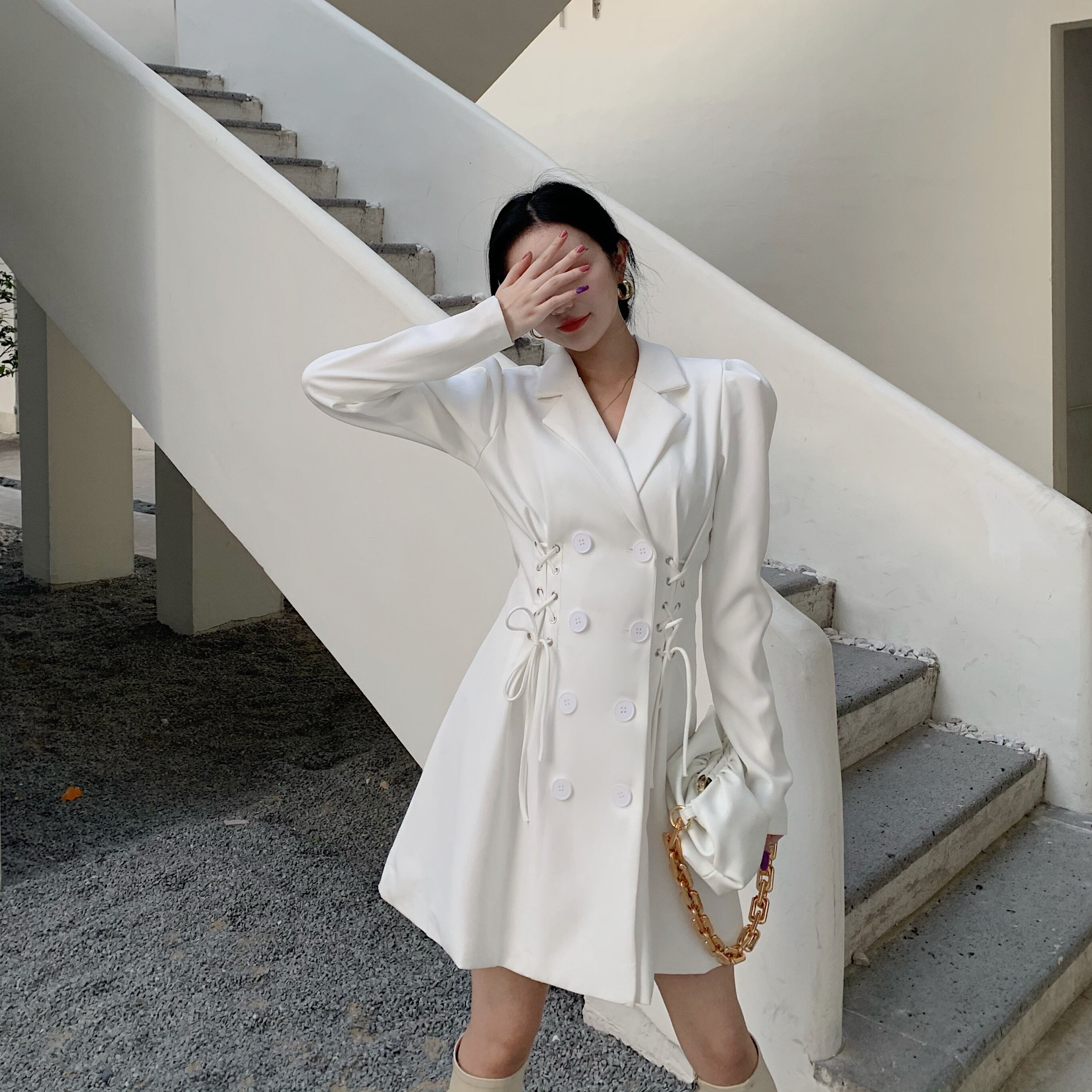 ダブルブレストラペルスーツドレス女性2020年秋新作黒長袖気質ショートスカートヘップバーンスカート ブラックストロベリース34575323255