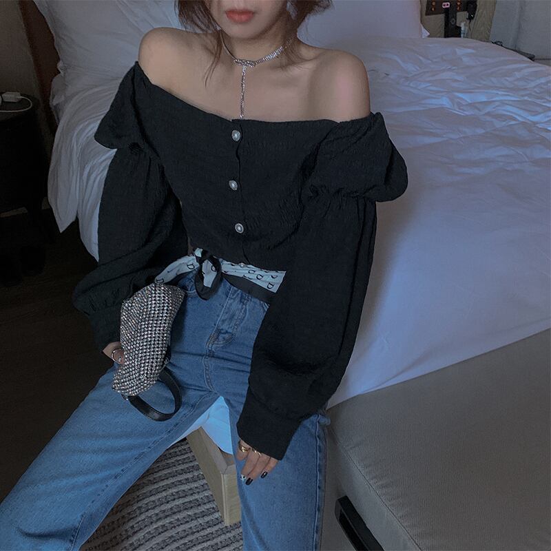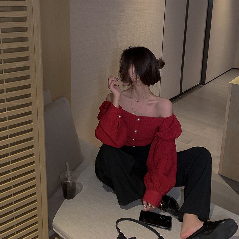 ワンショルダーパフスリーブシャツ女性の2020年秋ニューデザインセンスニッチシャツワインレッド長袖シャツ ブラックストロベリース6433471240