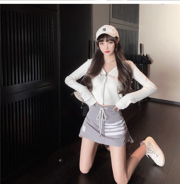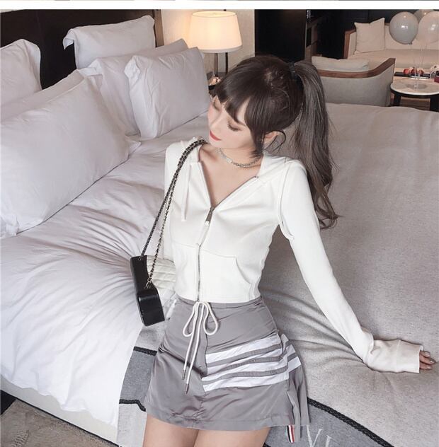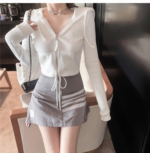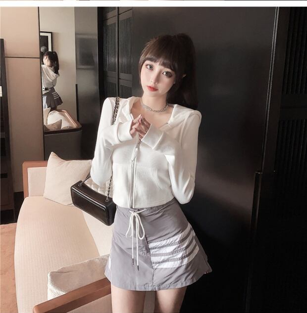 ホワイトニットフード付きジッパーセーターレディース初秋の自家栽培オールマッチ長袖ジャケット2020新作クロップドトップ ブラックストロベリース38796885309