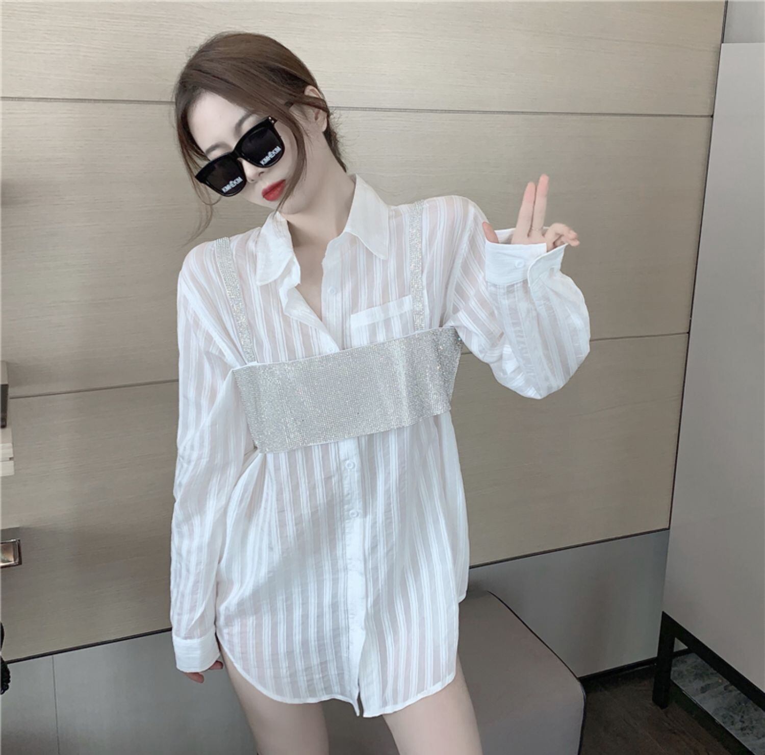 香港スタイルのストライプルーズ長袖シャツジャケットレディース秋ミドル丈シャツデザインニッチホワイトトップ ブラックストロベリース32920604093