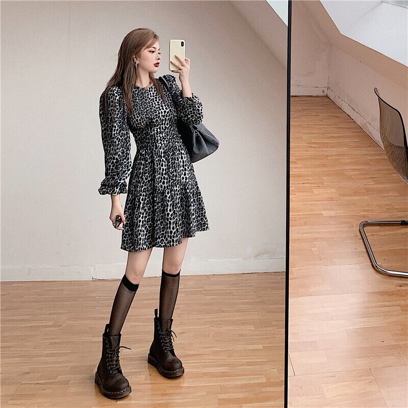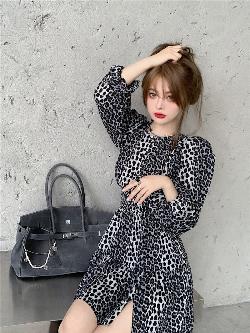 ヒョウ柄長袖ワンピース2020年秋新作セクシー気質スリムショートスカートブラックフリルスカート ブラックストロベリース65320426883