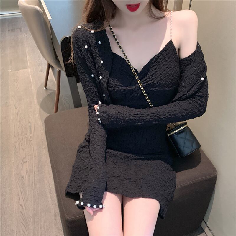気質スーツ女性2020年秋新しいファッションセクシーなスリングドレスニットトップツーピーススーツ ブラックストロベリース83195758625