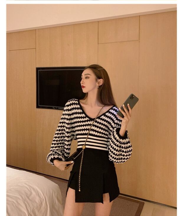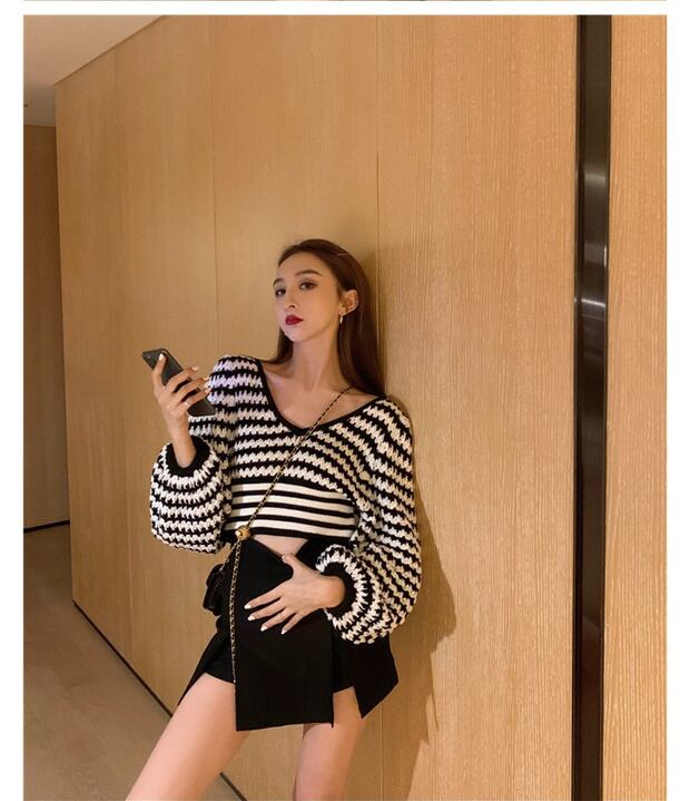 ストライプのVネックショート長袖セーター女性2020年秋新しいセーターボトミングブラックルーズプルオーバートップ ブラックストロベリース10242424935