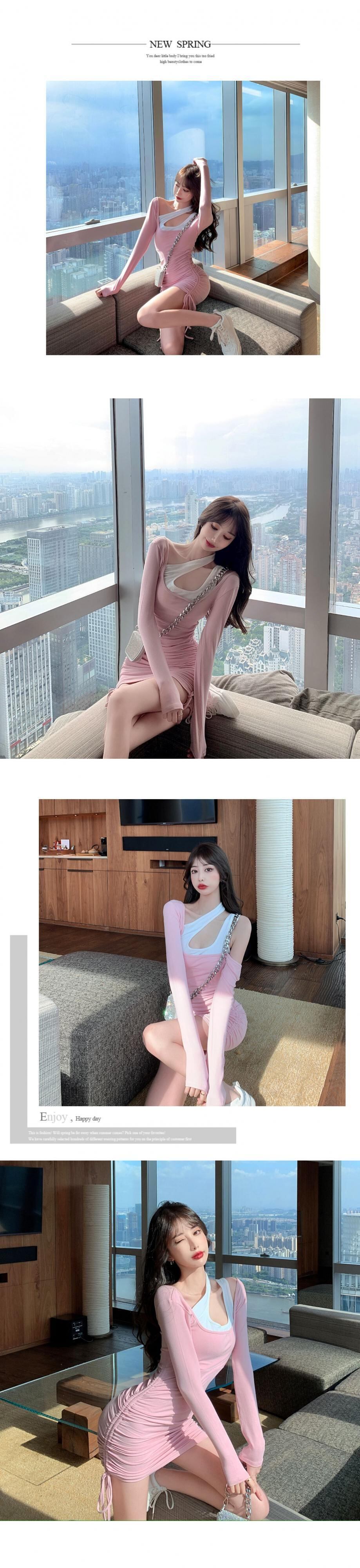 フェイクツーピースドレスレディース秋長袖タイトフィットヒップショートスカート2020新気質インナーベーススカート ブラックストロベリース77083145921