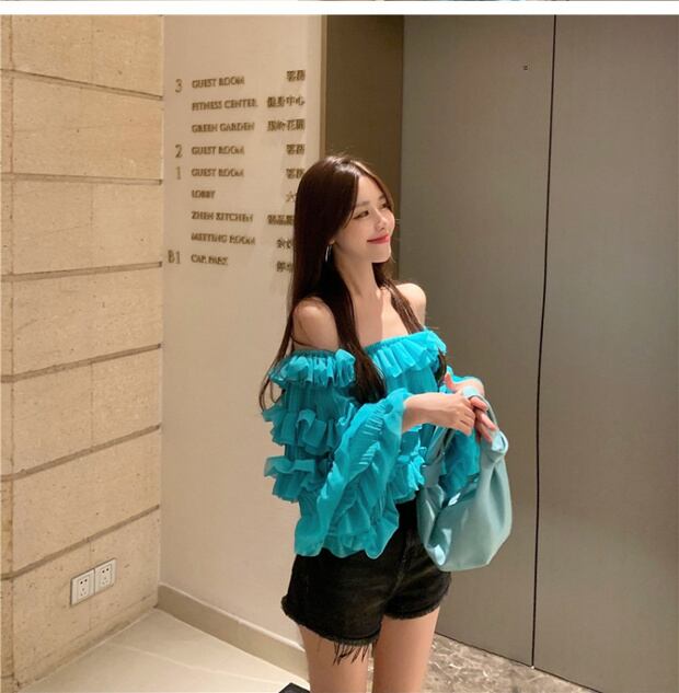 丁寧なマシンストラップレスデザインセンス長袖シフォンシャツ女性秋白セクシーワンショルダースモールシャツショートトップ ブラックストロベリース10724822166