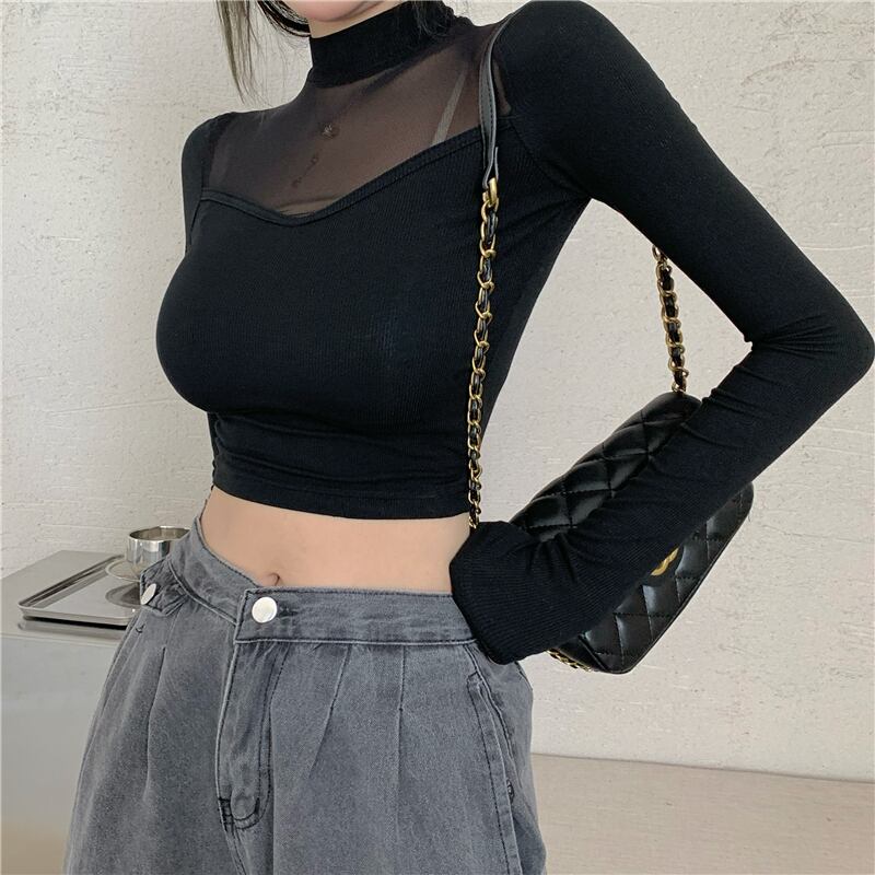 ブラックメッシュステッチハーフハイネックニットTシャツレディース秋のタイトフィット長袖ボトミングシャツ、ショートトップ ブラックストロベリース18137421148
