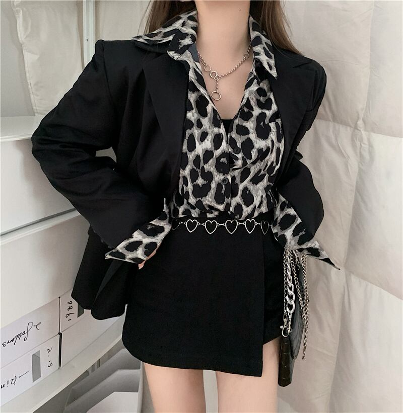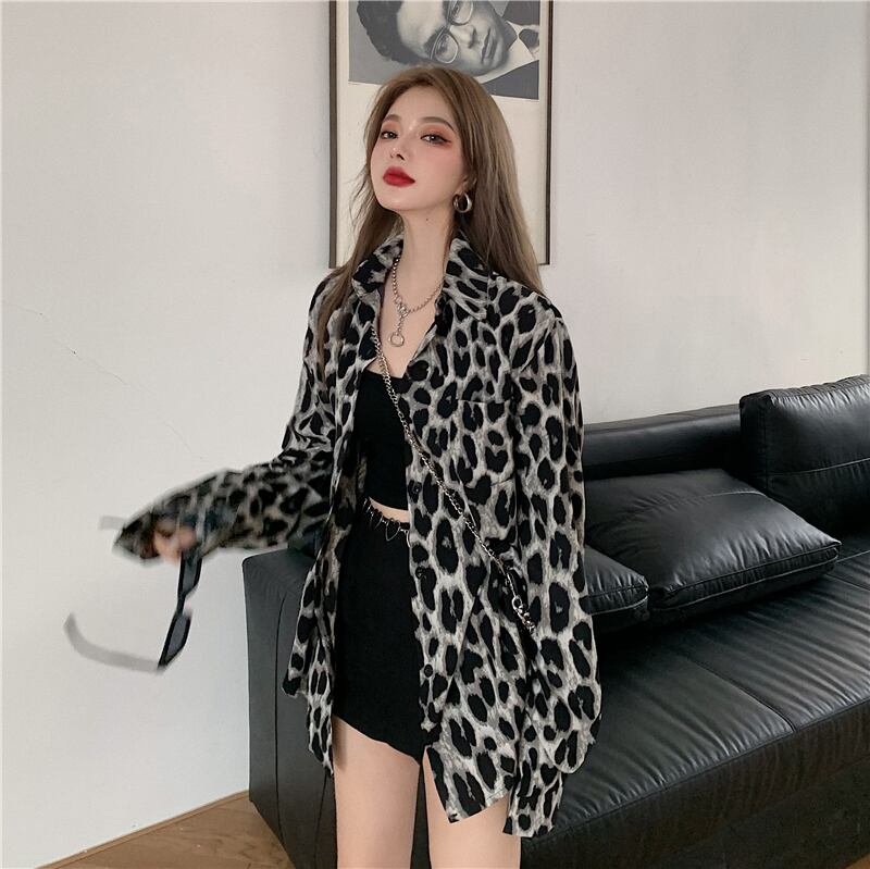 レトロな香港風味のヒョウ柄長袖シャツレディース秋のルーズシャツジャケットデザインニッチミドル丈トップ ブラックストロベリース80898174885