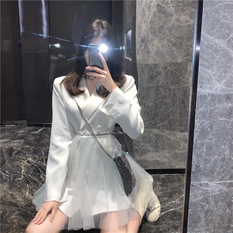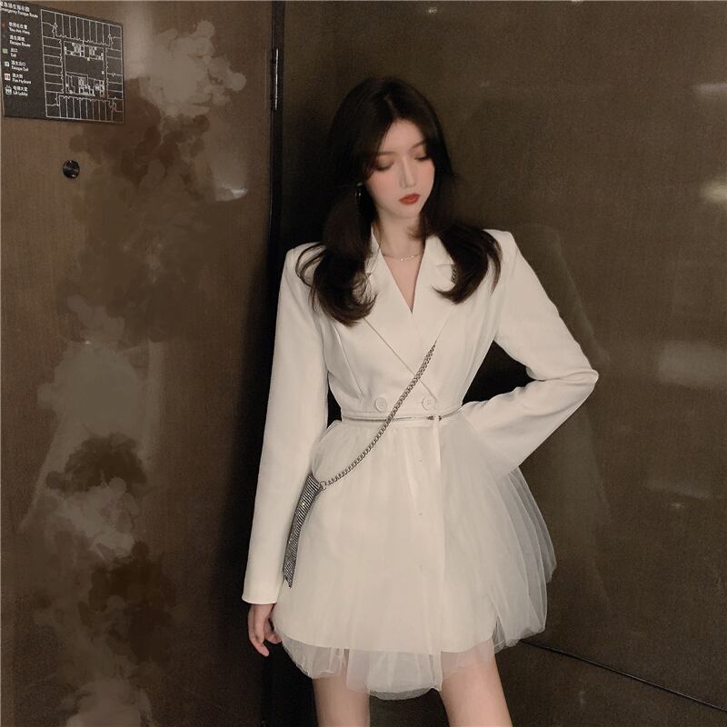 ホワイトメッシュステッチスーツカラードレス秋の長袖スリムショートスカート2020新しいハイウエストフェアリースカート ブラックストロベリース73495972634
