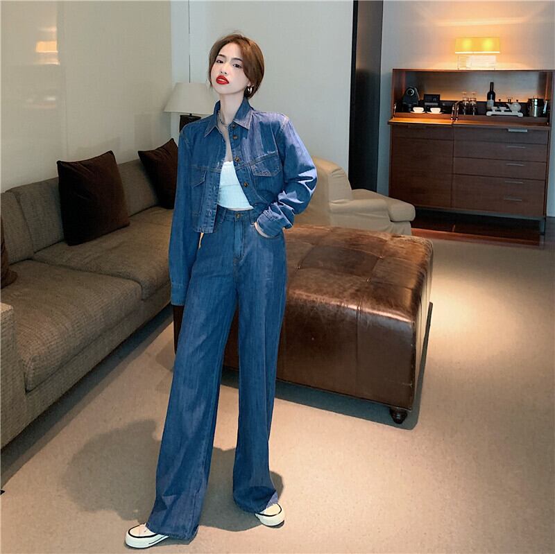 Yujieスタイルのeignファッションスーツの女性2020年秋ニューデニムショートコートカジュアルワイドレッグパンツツーピーススーツ ブラックストロベリース95797666336