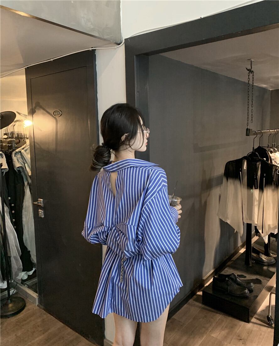ブルーストライプホルターシャツレディース秋ルーズ長袖シャツデザインニッチミドル丈トップ ブラックストロベリース15121419302