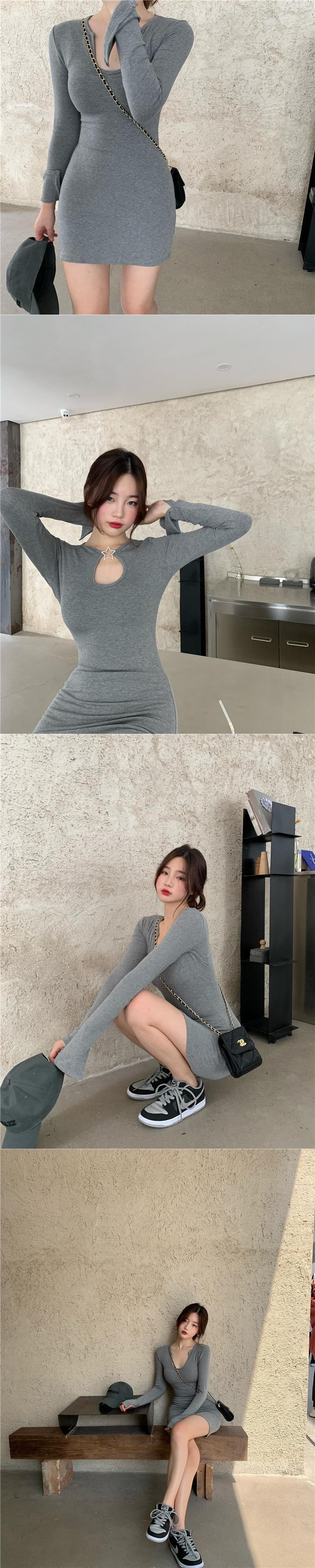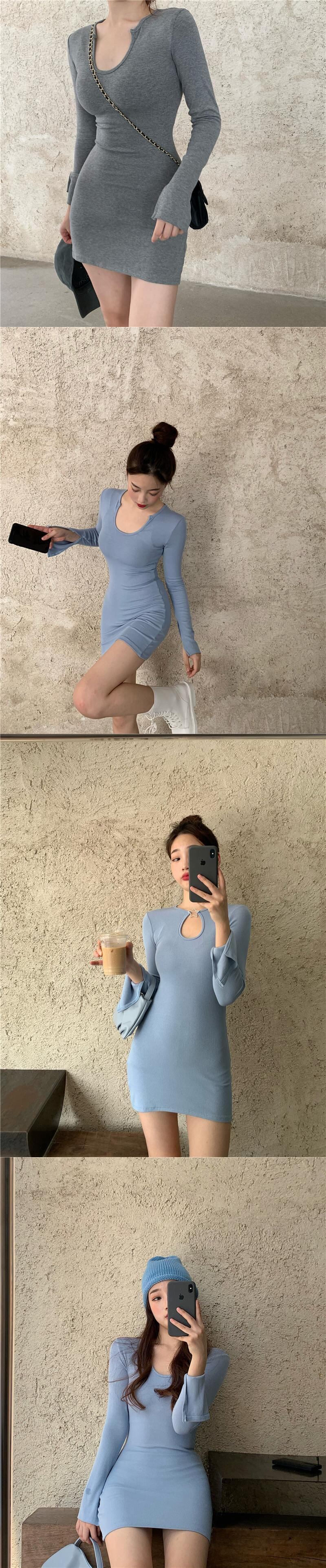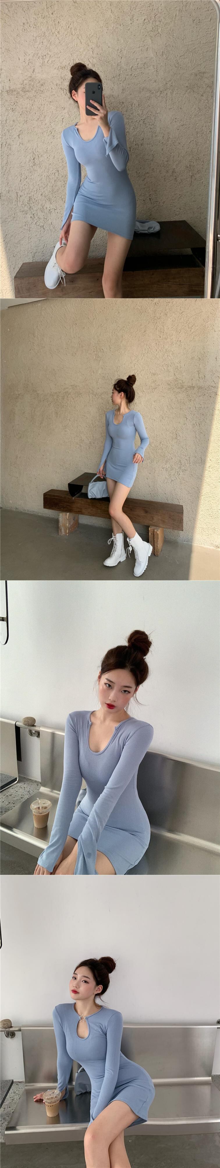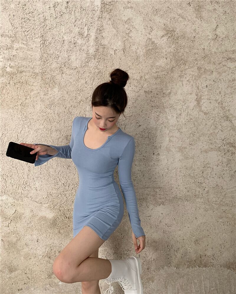 長袖のセクシーな中空タイトフィットインナー長袖ドレス女性の2020年秋新しい青いショートスカートスリムスカート ブラックストロベリース6535195696
