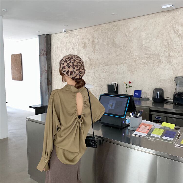ミッドレングスデザインホローオープンバック長袖シャツトップレディース2020秋新作ルーズシャツジャケット ブラックストロベリース28390926005