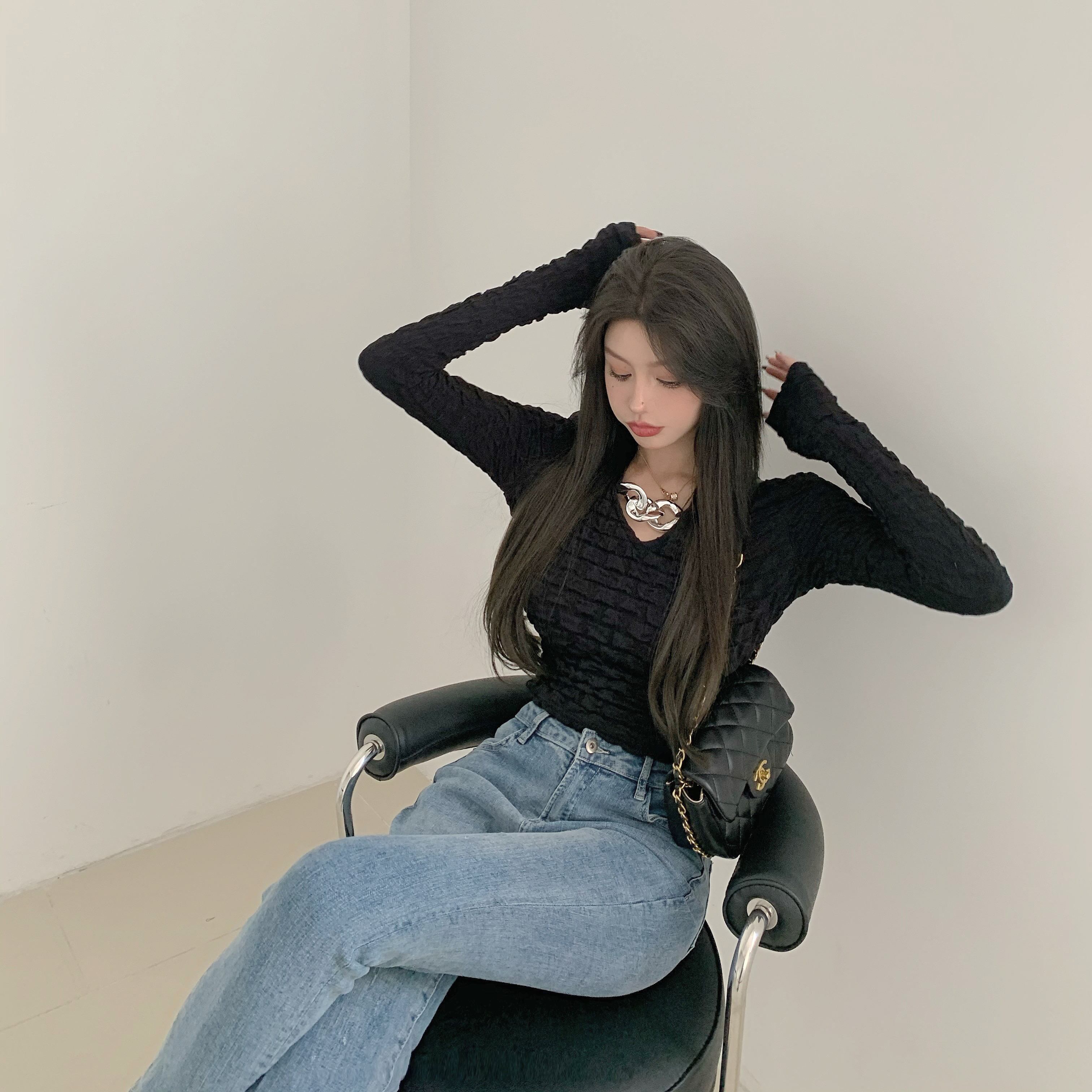 ブラックデザインセンスプルオーバーニットボトミングシャツレディース秋新作スタイルタイトVネック長袖半袖インナートップス ブラックストロベリース3913316002