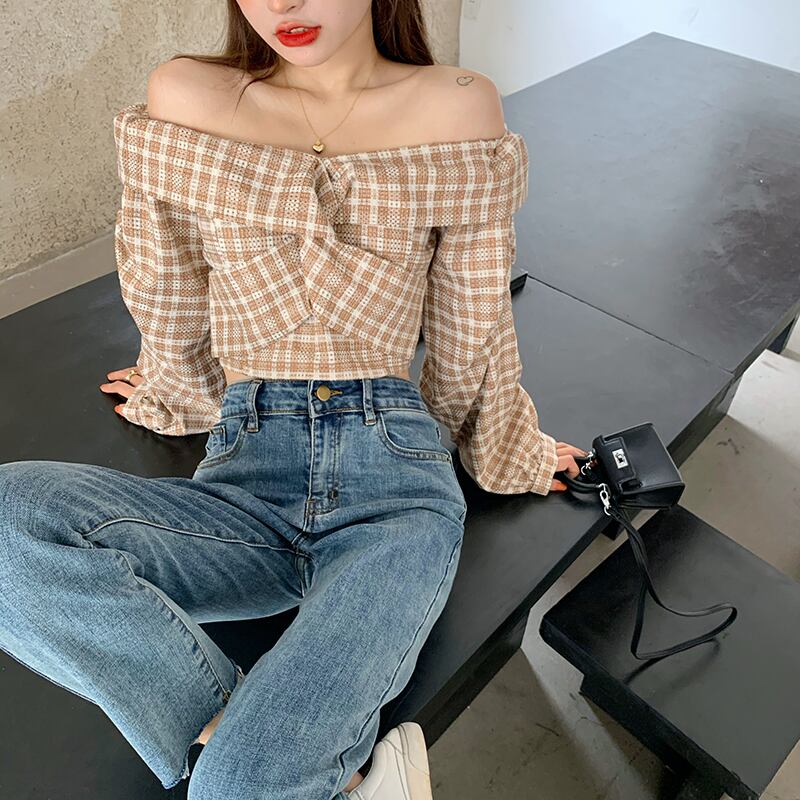 センス香港スタイルのレトロな黒の格子縞のシャツ女性の秋のセクシーなストラップレススリム長袖シャツニッチトップ ブラックストロベリース77302314535