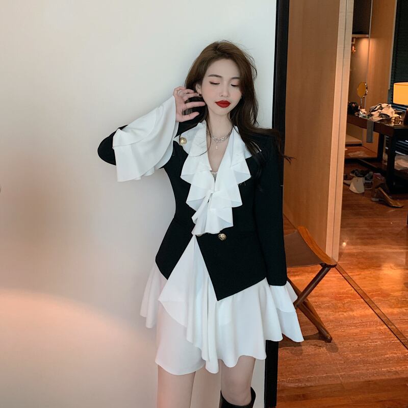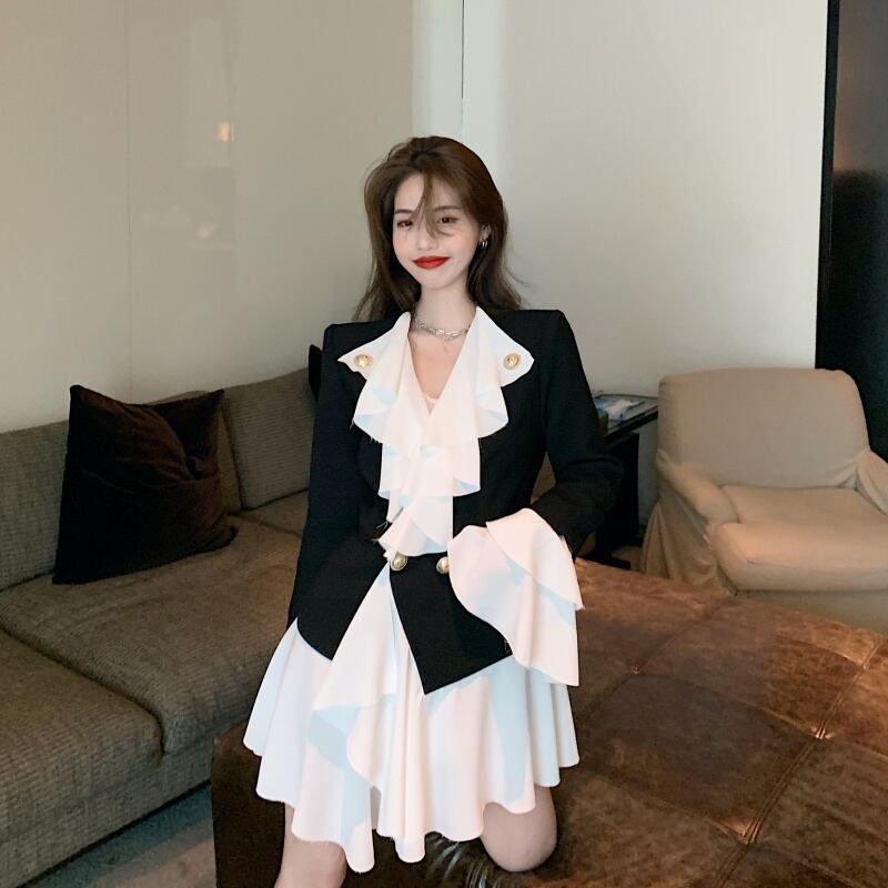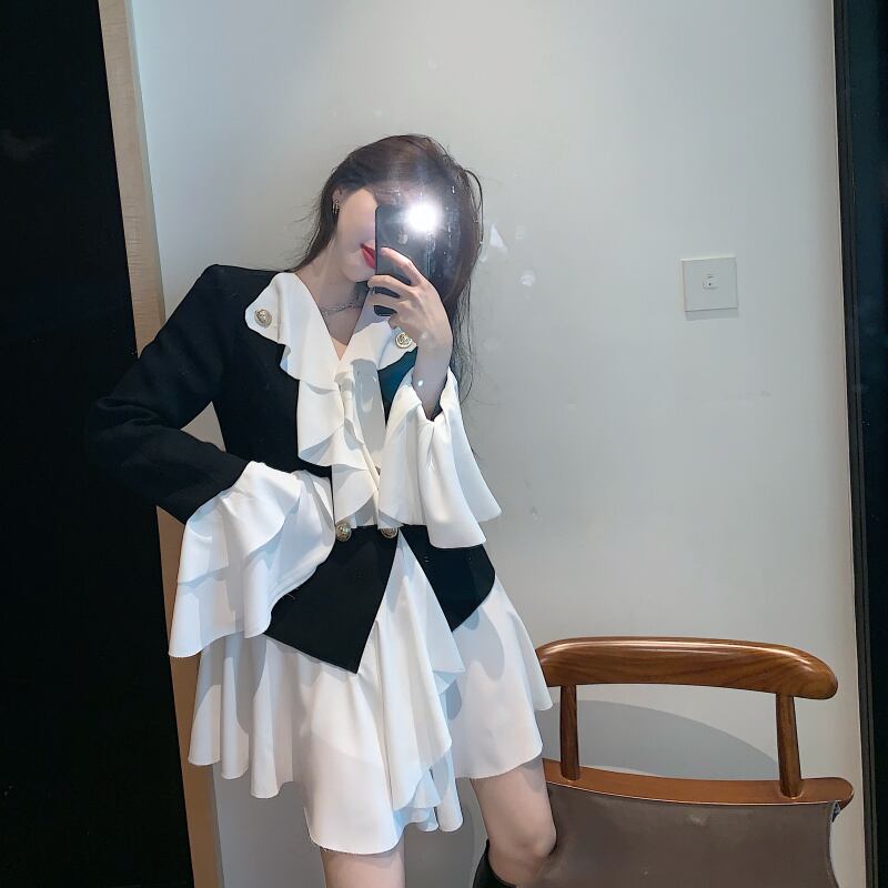 フレンチレトロニッチスーツドレス女性秋フリル長袖ショートスカート2020新シフォンスカート ブラックストロベリース33267625694