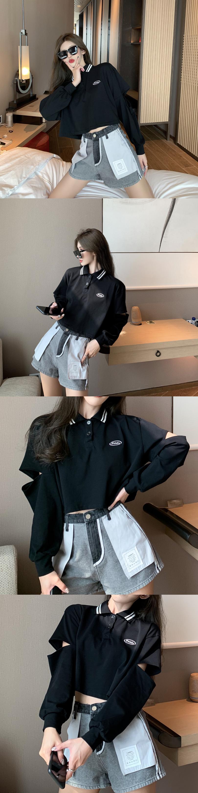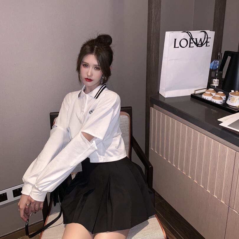 ショートハイウエスト刺繡ルーズブラックポロカラー長袖Tシャツレディース2020年秋新作ワイルドトップ ブラックストロベリース89615076724