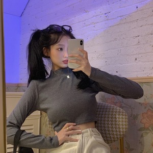 ショートハイウエストタイトフィットハーフハイカラーグレー長袖Tシャツレディース2020年秋新作インナーベースシャツトップス ブラックストロベリース40934106300