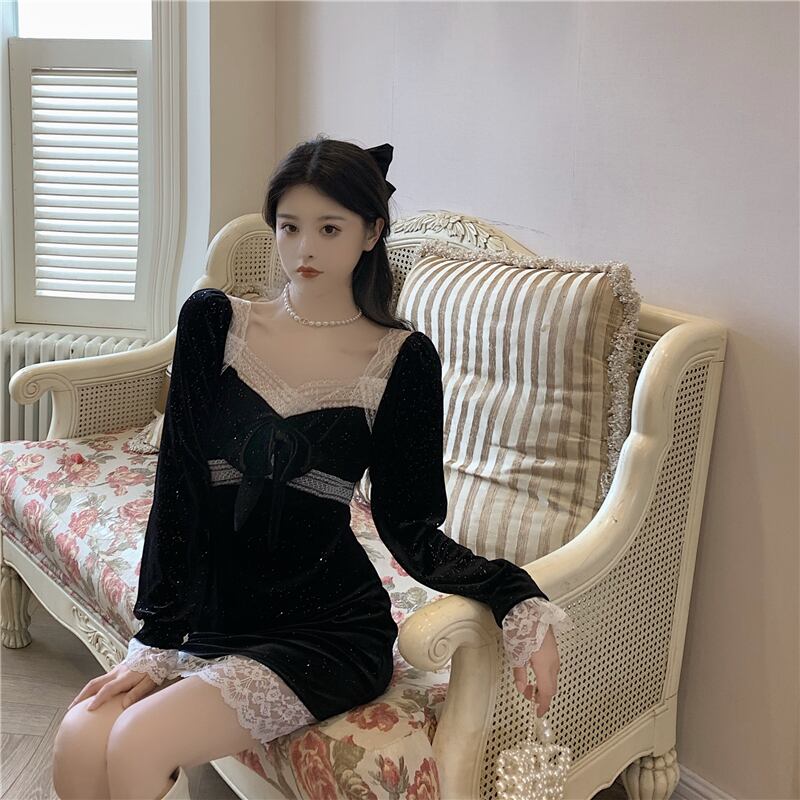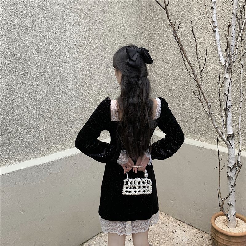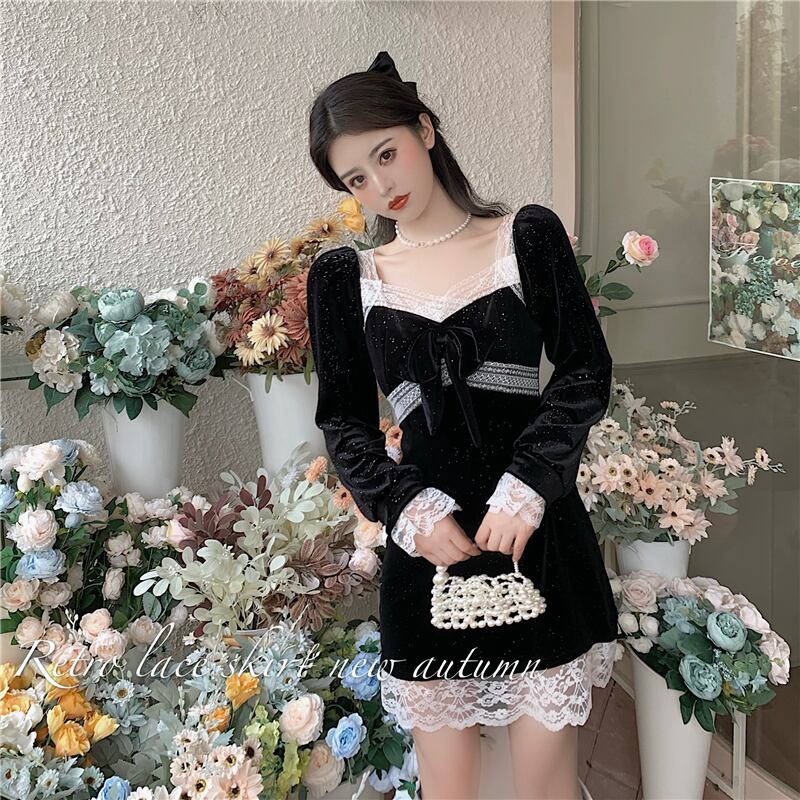 レースステッチベルベットボウ長袖ドレス女性の2020年秋新しい黒のショートスカートタイトスカート ブラックストロベリース5400647776