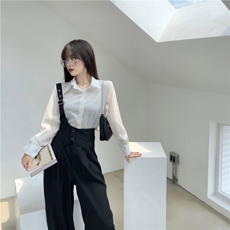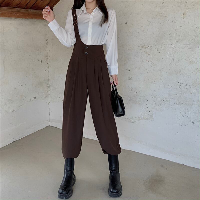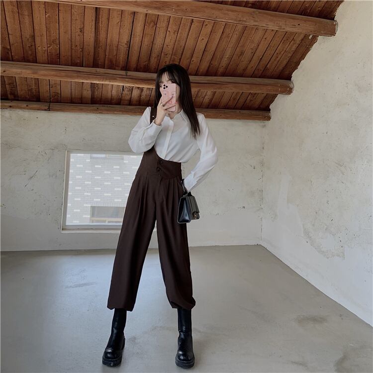 黒のハイウエストスリムツーリングワンショルダーオーバーオールレディース2020秋新作オールマッチハンサムパンツカジュアルパンツ ブラックストロベリース72716685401
