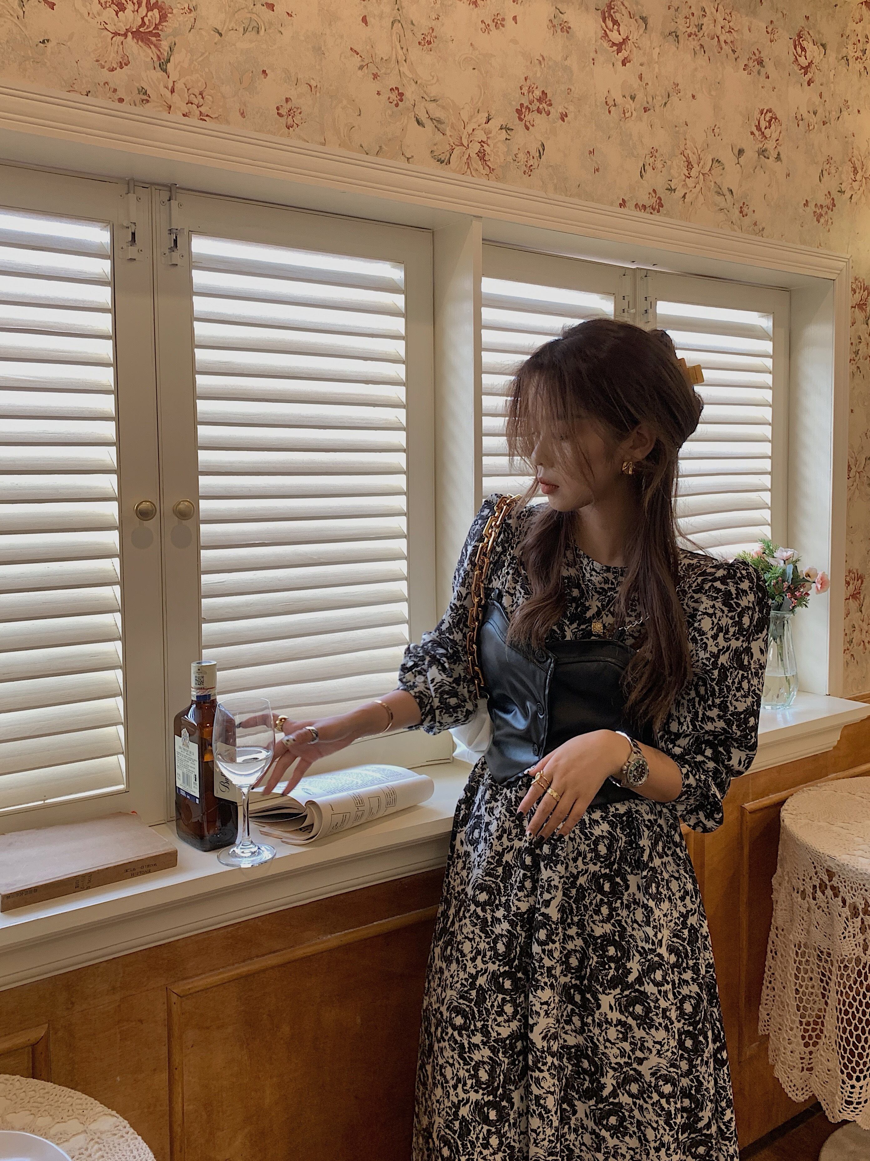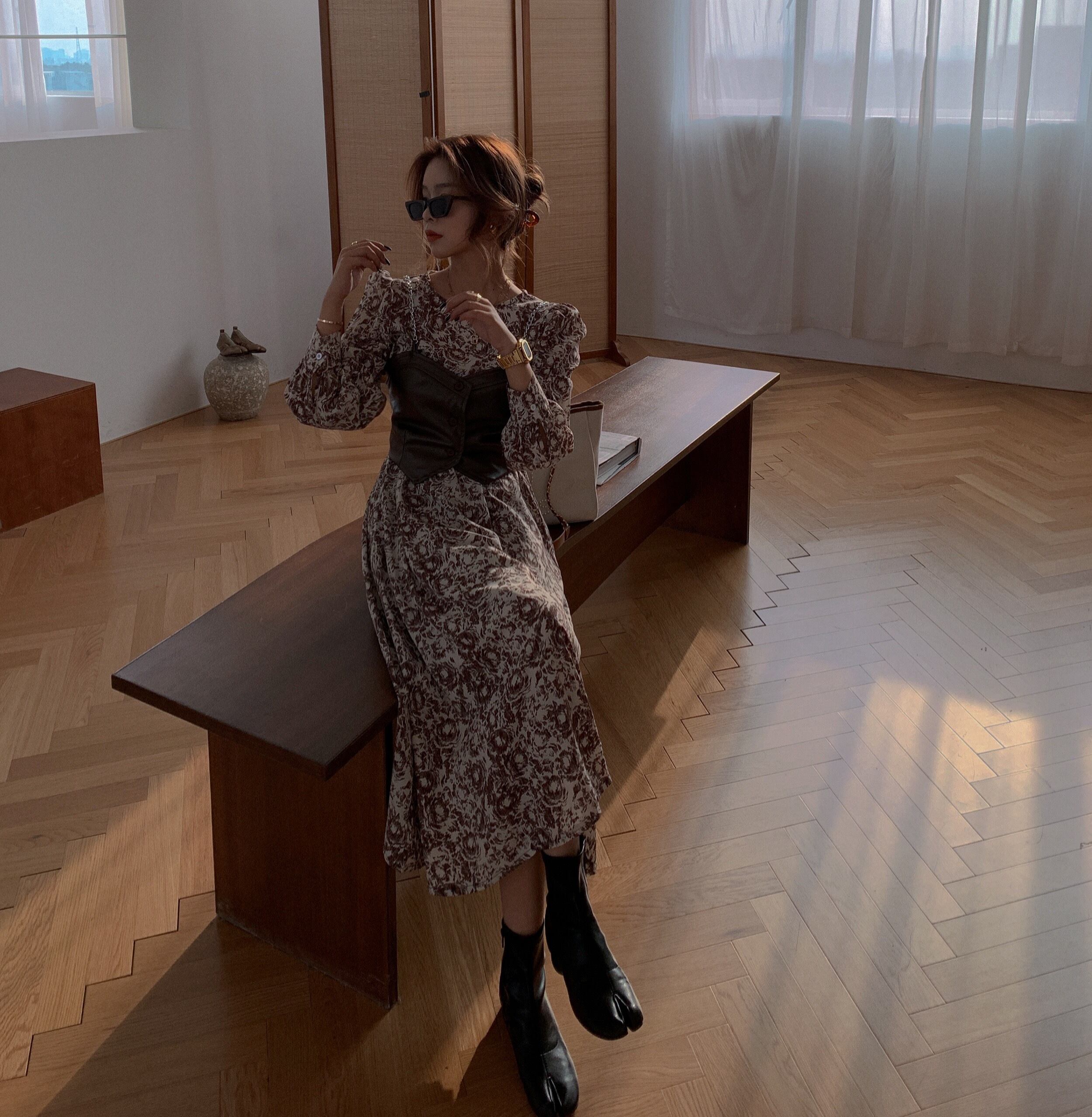 フレンチレトロニッチフローラル長袖ワンピースレディース秋ミドル丈スカート2020新気質スリムスカート ブラックストロベリース5371485311
