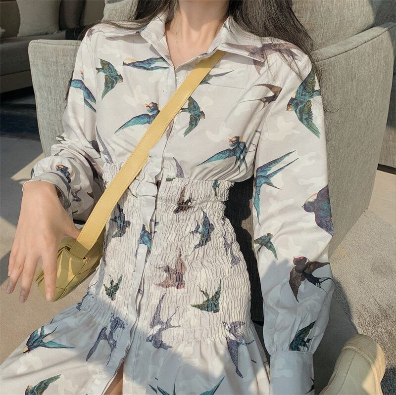 ウエストプリント気質長袖シャツワンピース2020秋新作ショートスカートは薄手のレトロな女神ファンスカート ブラックストロベリース99070803254