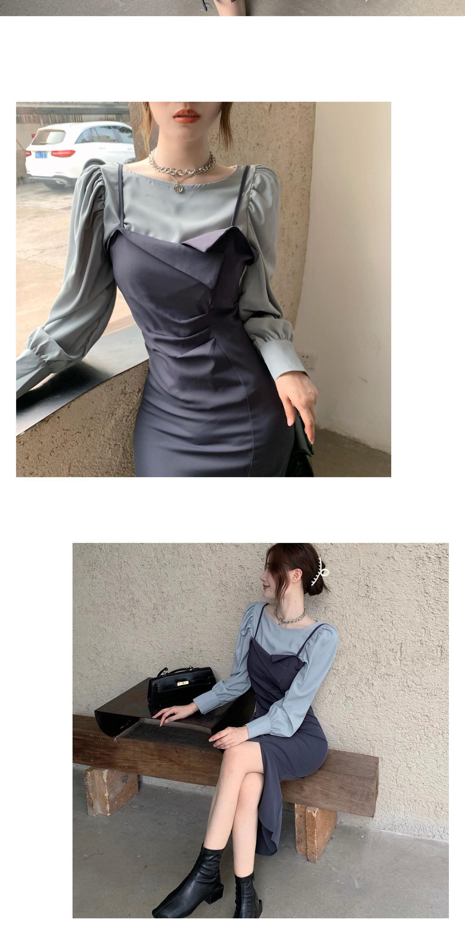 色:ブルーランタンスリーブトップ,ブルーサスペンダードレス