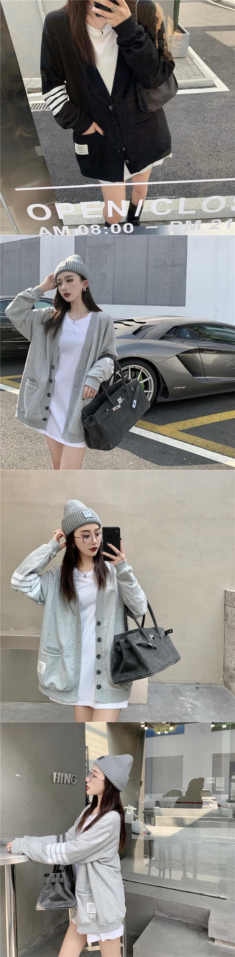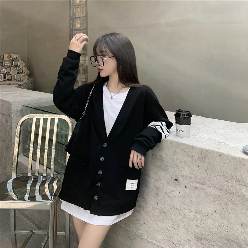 ブラックルーズストライプ長袖セーターカーディガンジャケットレディース2020秋新作インタイドバージョンのワイルドトップ ブラックストロベリース49078380371