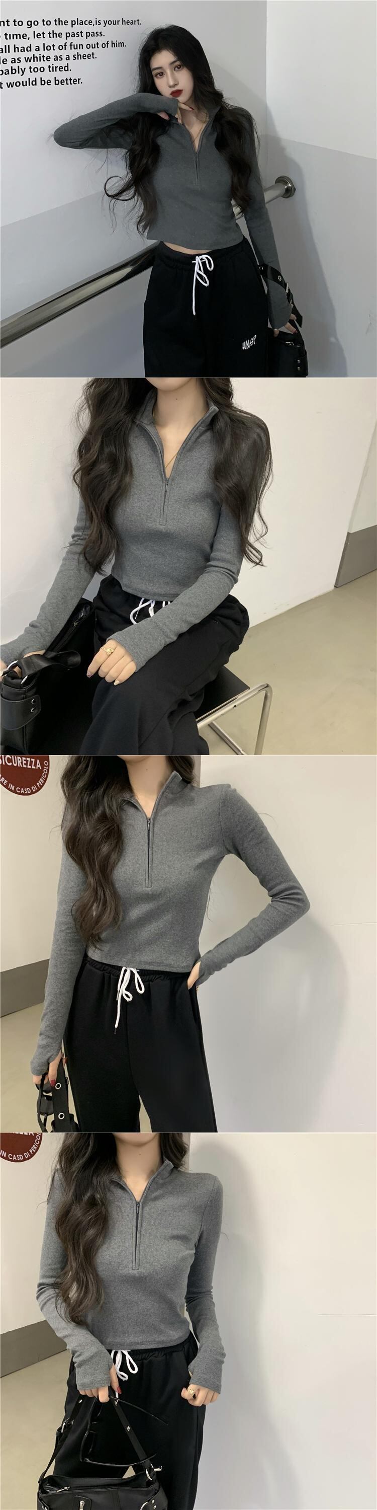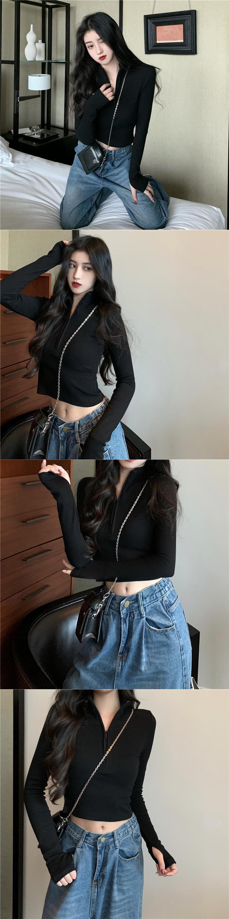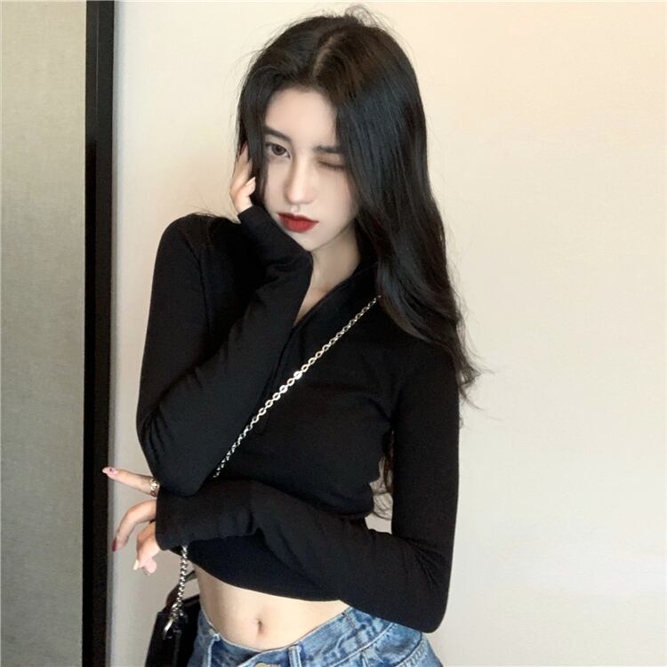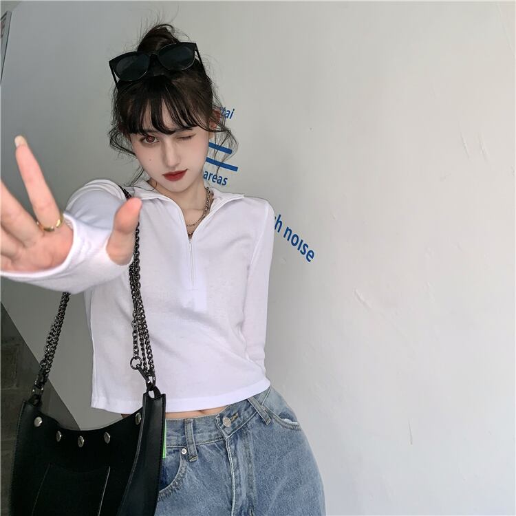 ジッパーホワイトTシャツ女性秋ルーズ長袖ボトミングシャツ2020新しいインナーショートトップイントレンド ブラックストロベリース57373598017