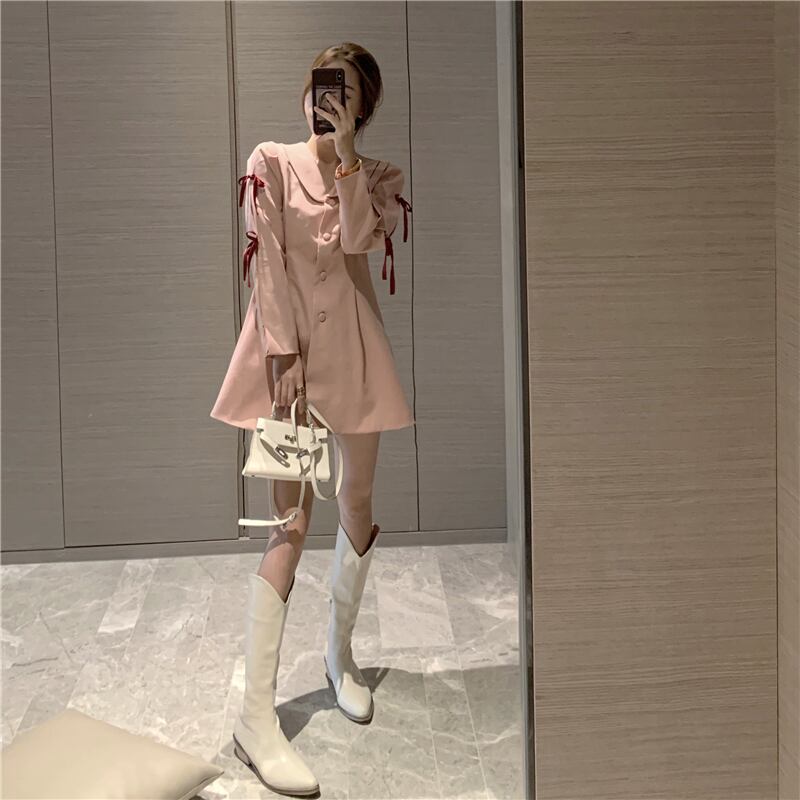 ボウノットスモールスーツジャケット女性2020秋新気質ブリティッシュスタイルスモールスーツスカートピンクトップ ブラックストロベリース51110459812