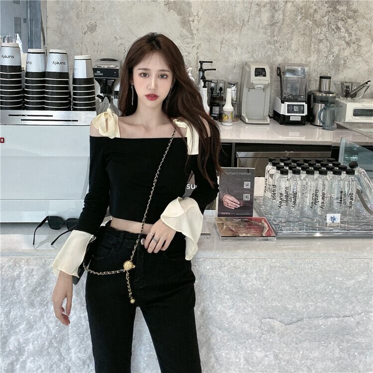 ワンショルダーショートタイトフィットステッチ長袖Tシャツレディース2020年秋新作センスインナーベースシャツトップス ブラックストロベリース10886613946