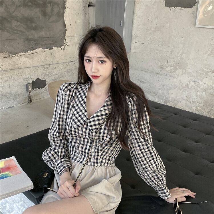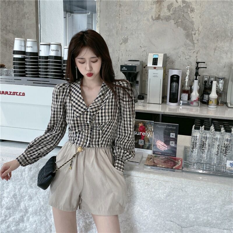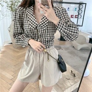ニッチドールカラー長袖チェック柄シャツトップレディース2020秋新作パフスリーブショートシャツ ブラックストロベリース80617014955