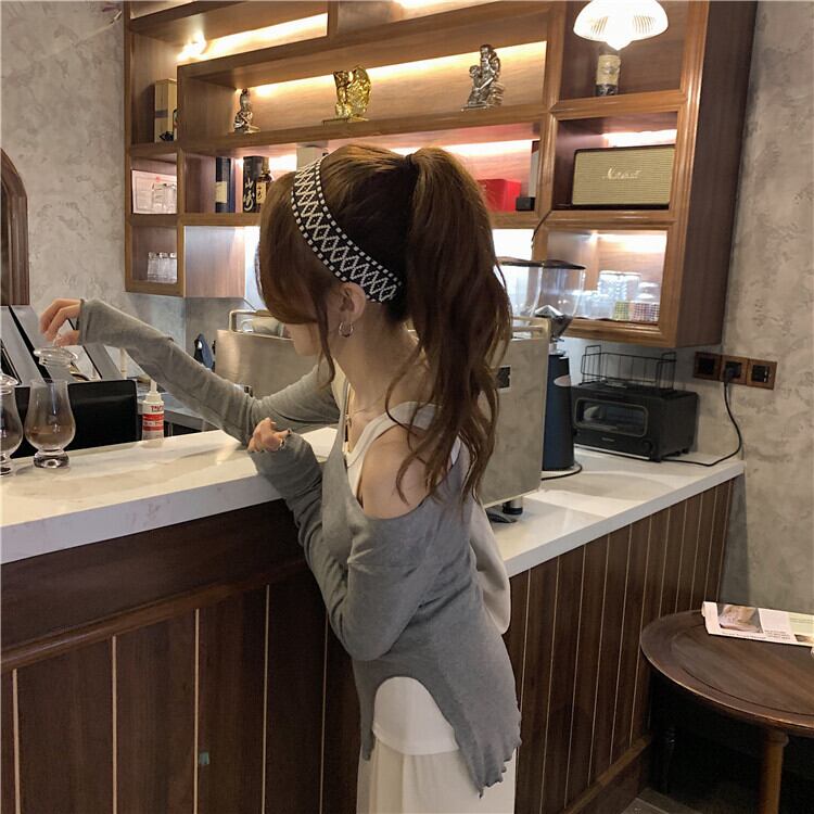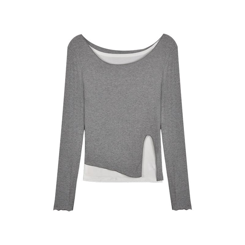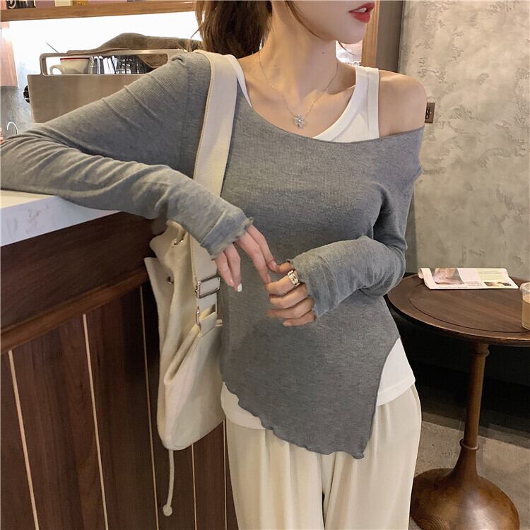 ステッチ不規則な偽のツーピース長袖Tシャツ女性の2020年秋新しいストラップレスタイトフィットインナーベースシャツトップ ブラックストロベリース71018618934