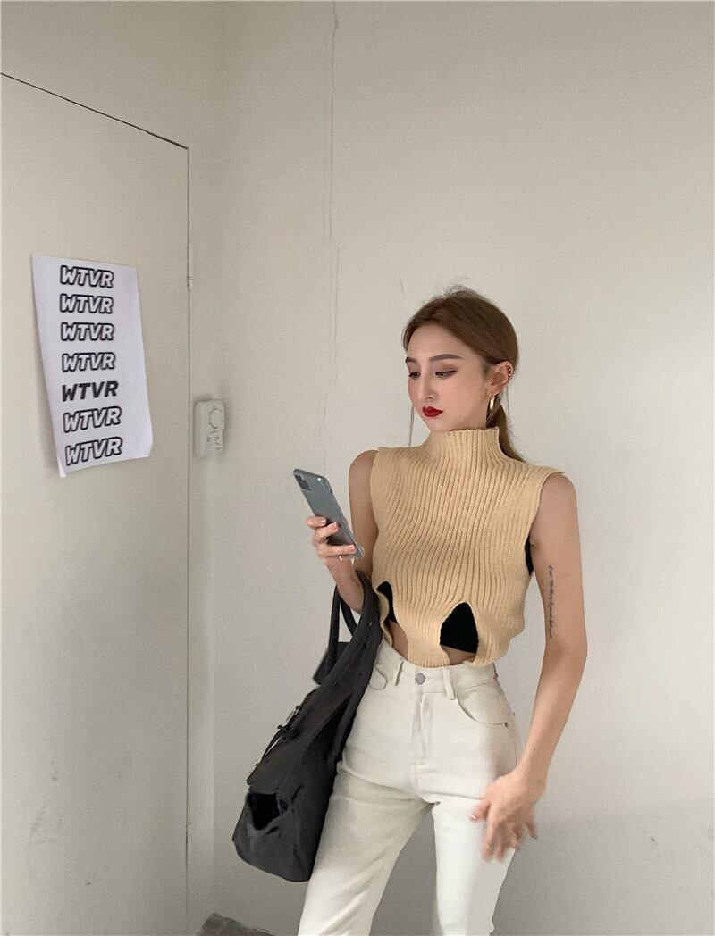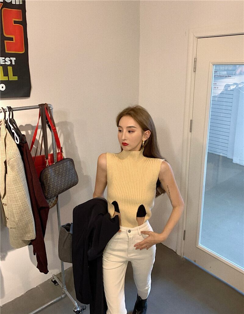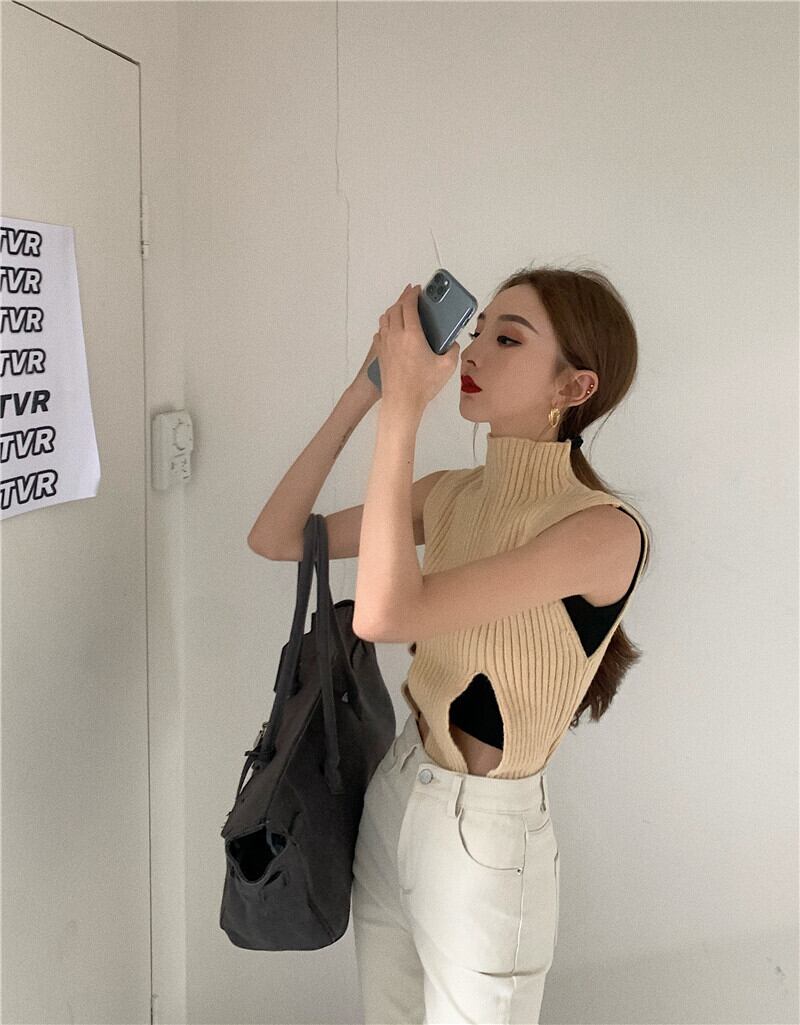アプリコットニットタートルネック中空ノースリーブチョッキベストレディース秋新作ルーズ長袖セーターコートジャケット ブラックストロベリース77138197252